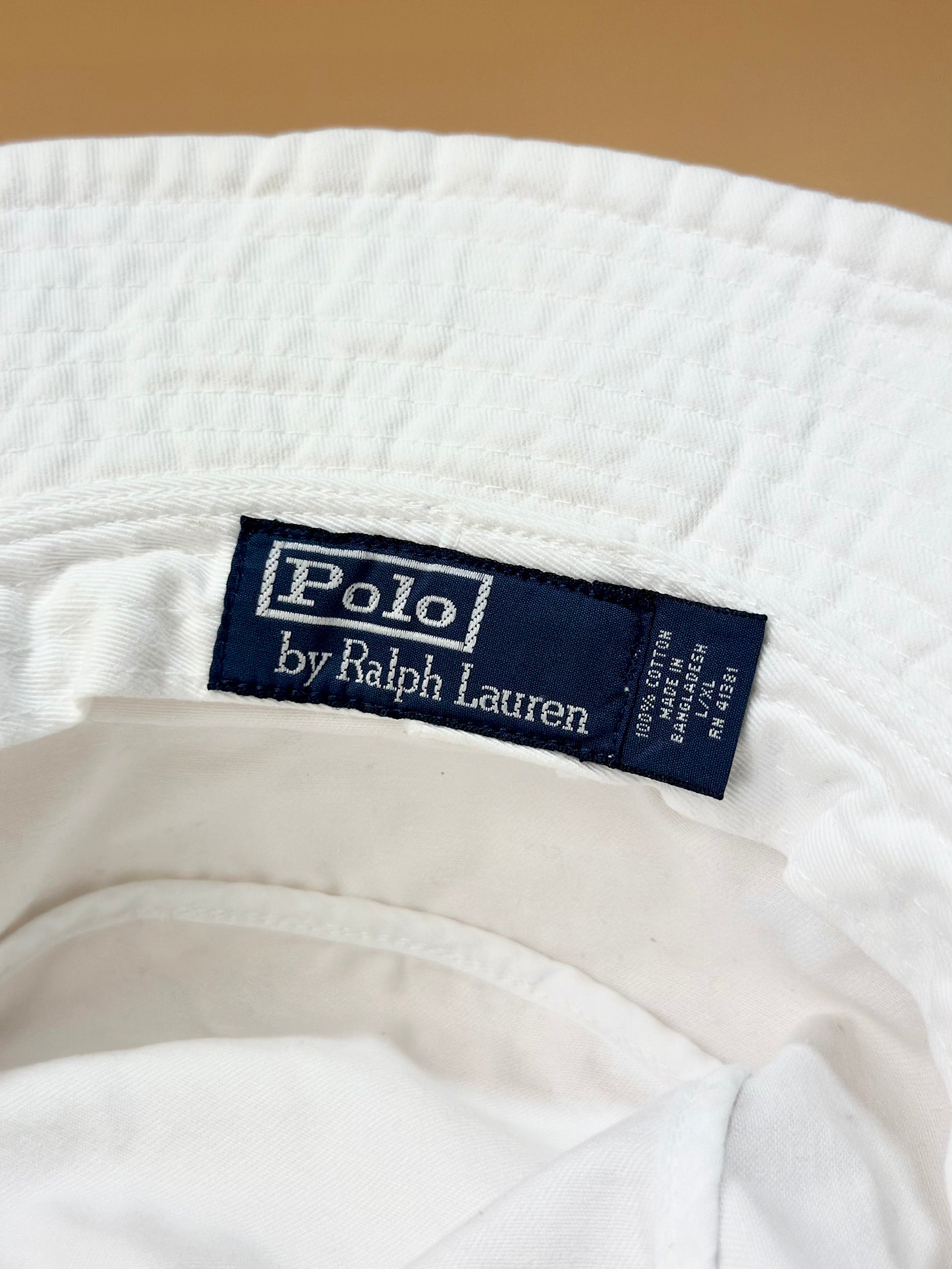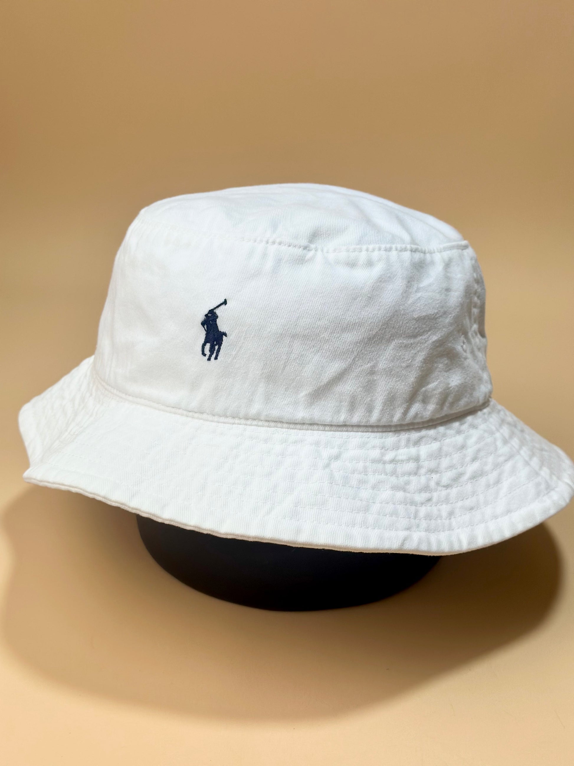 Clean and classic – Ralph Lauren White Bucket Hat with bold black pony.